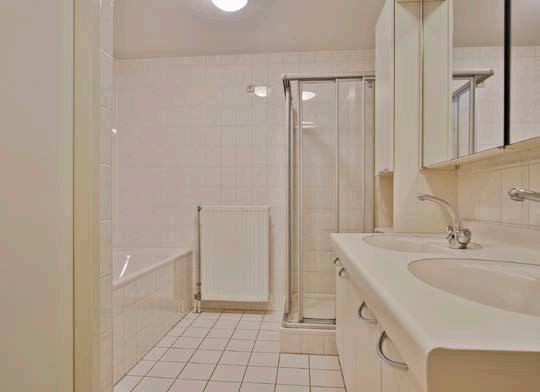 De badkamer is stijlvol en praktisch ingericht met een dubbel wastafelmeubel, een ligbad, een douche en een toilet. Hier kun je elke dag genieten van een ontspannen bad of een verfrissende douche. De nette afwerking en de aanwezigheid van moderne voorzieningen zorgen voor gemak.