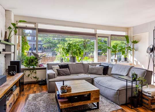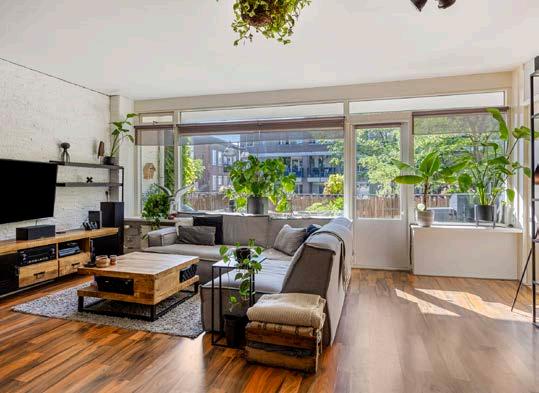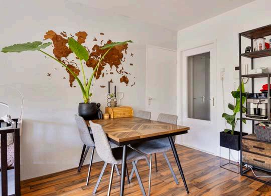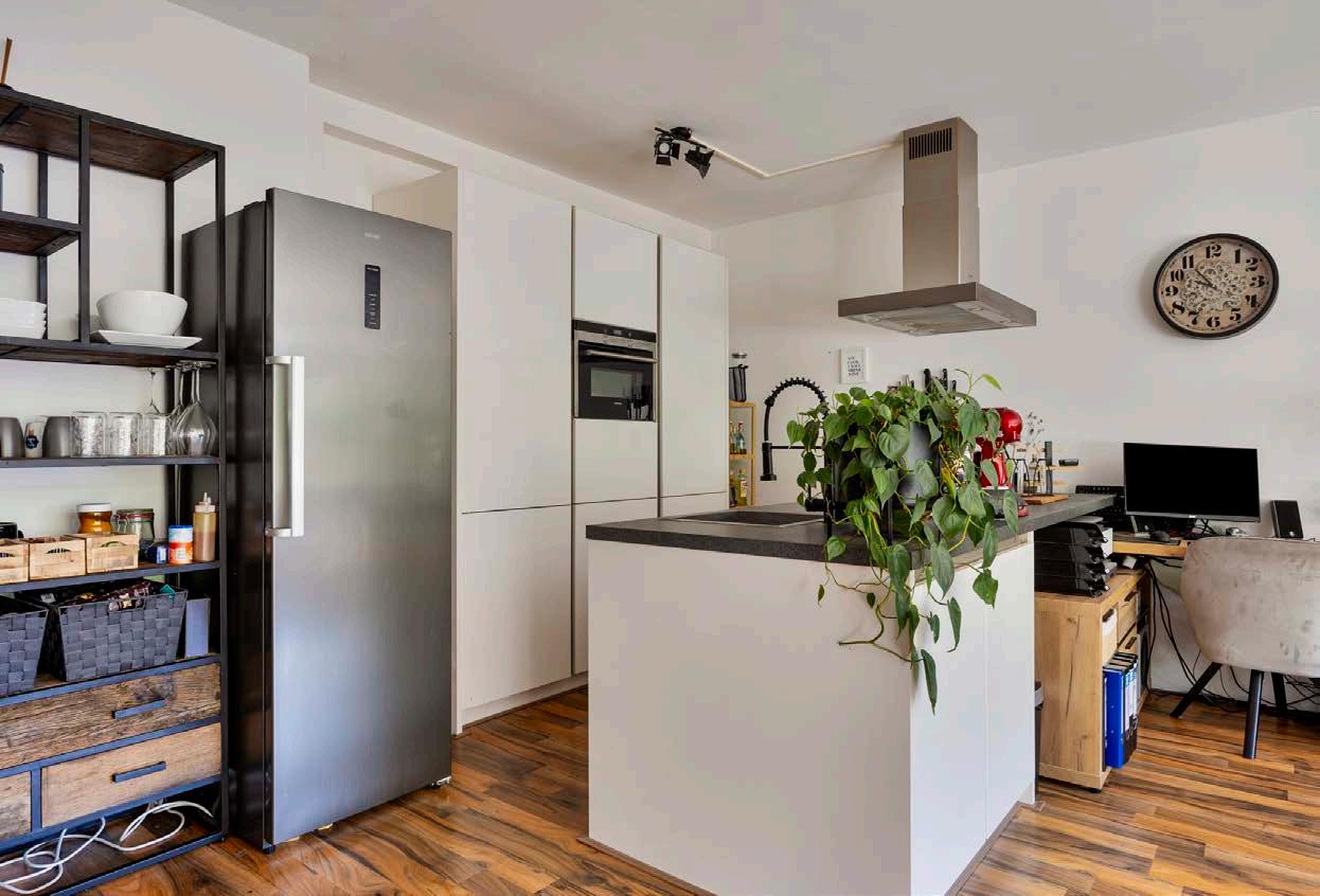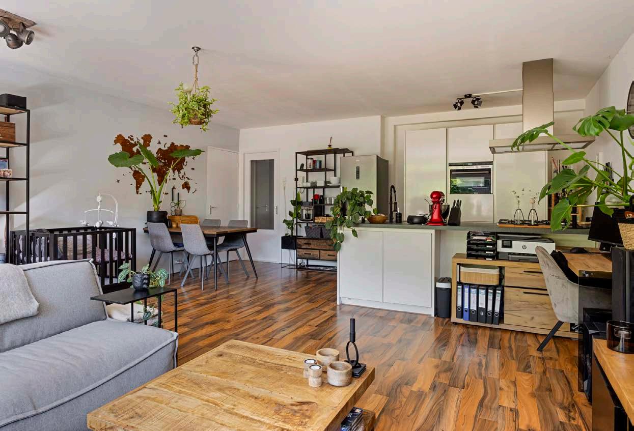 Bij binnenkomst in dit appartement valt meteen de ruime en lichte woonkamer op. Grote ramen laten veel daglicht binnen en bieden een mooi uitzicht over de stad. De houten vloeren en witte muren geven een moderne uitstraling aan deze ruimte.