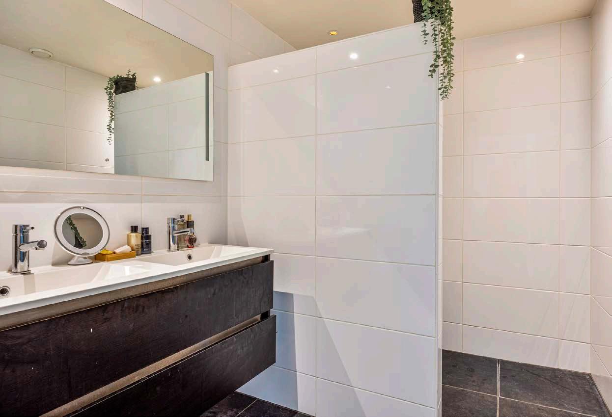 De badkamer is modern afgewerkt en biedt alles wat je nodig hebt.