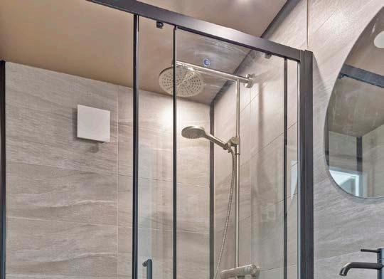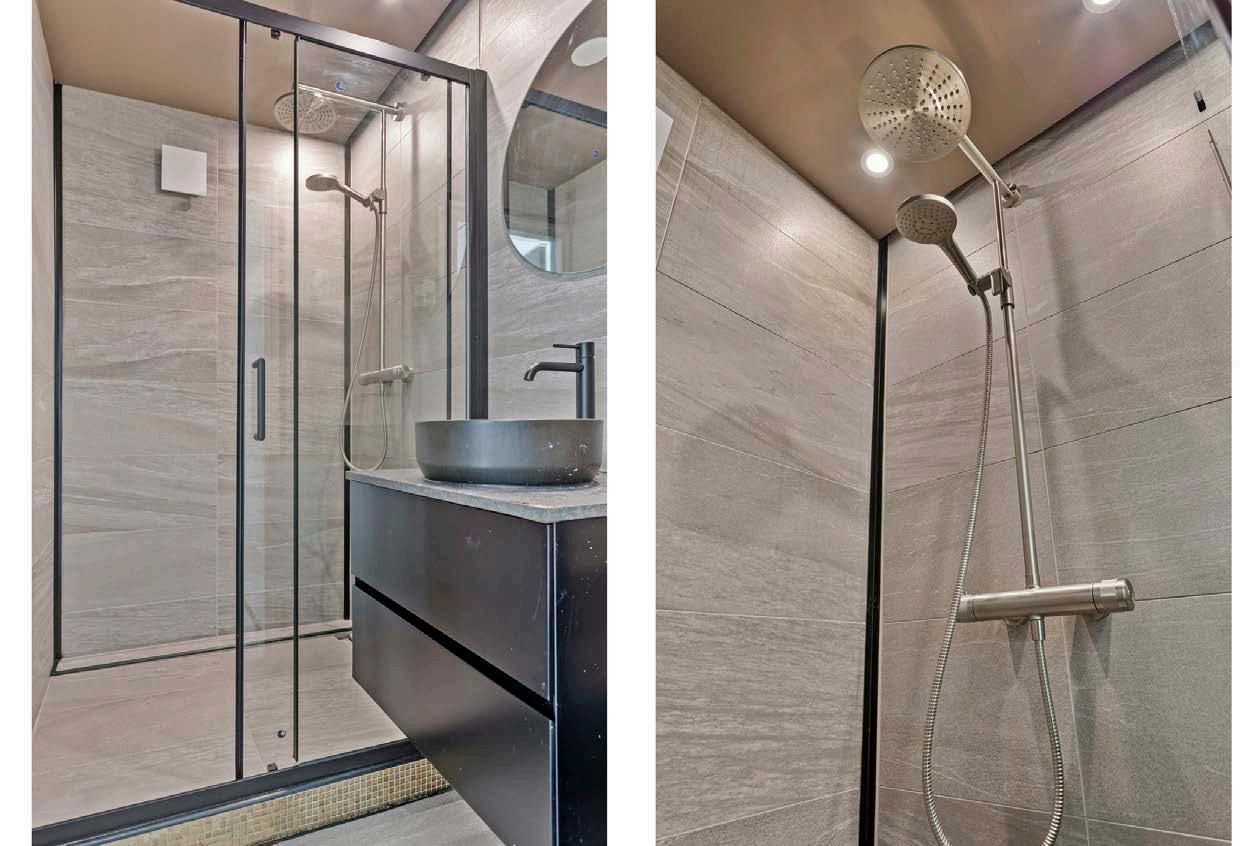 De badkamer is modern en strak afgewerkt, met een ruime inloopdouche en een wastafel met wastafelmeubel. Een fijne plek om je dag te beginnen of af te sluiten.