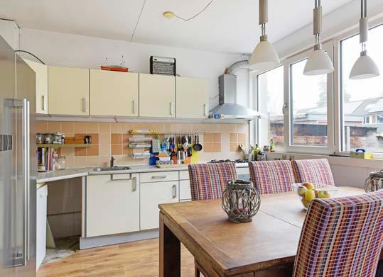 Aan de voorzijde is de dichte keuken gesitueerd. Het keukenblok is geplaatst in een wandopstel ling en uitgevoerd in een lichte kleur, echter is het geheel eenvoudig waardoor je hier je droomkeu ken kunt plaatsen in de kleur, opstelling en met de apparatuur die jij wenst.