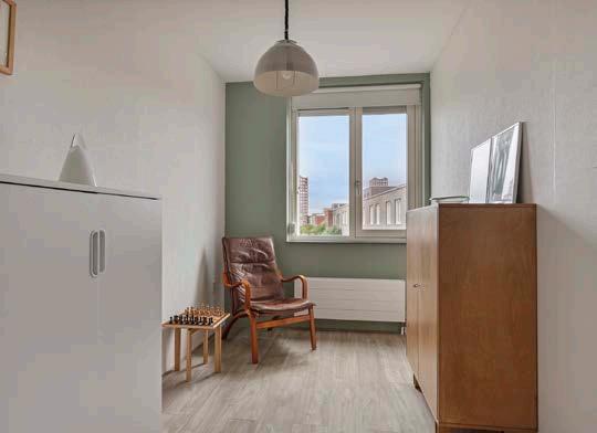 De vloer in de woonkamer is recent vernieuwd en straalt een warme, uitnodigende sfeer uit door de PVC visgraatvloer en gestuukte muren. Deze combinatie zorgt voor een tijdloze uitstraling die zowel modern als gezellig aanvoelt, perfect voor ontspanning en bijeenkomsten.