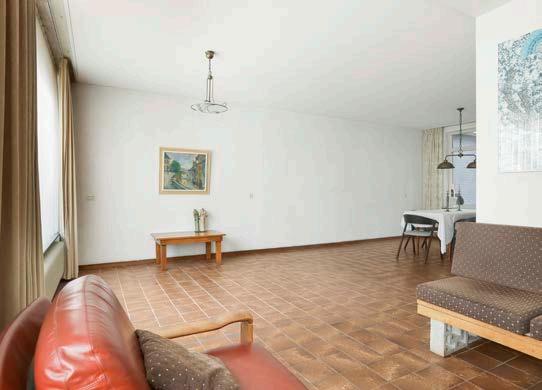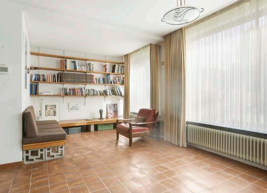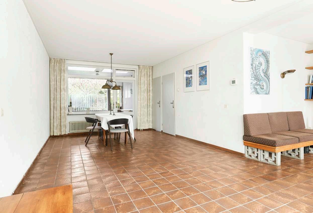 Vanuit de entreehal kom je binnen in een royale woonkamer in L-vorm. De voorkamer is voorzien van grote ramen met uitzicht op de onlangs aange legde voortuin en enkele bungalows. Op de vloer liggen plavuizen in terra kleur, de wanden zijn afge werkt met sierpleister.