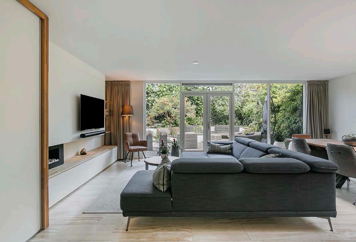 De royale woonkamer is afgewerkt met gestucte wanden en er is natuurstenen vloer met vloerverwarming aanwezig, wat zorgt voor een aangename en gelijkmatige warmte. De grote glazenpui en de lichtkoepel zorgen voor veel lichtinval.