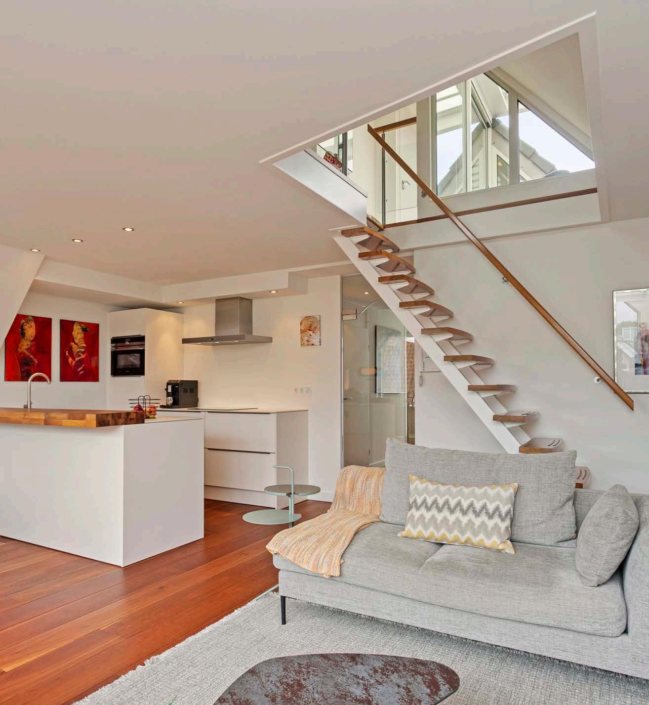 De trap in de woonkamer leidt naar de bovenverdieping, waar een derde slaapkamer en een werkkamer zijn gesitueerd. De aanwezige vide en slimme opbergruimte onder de schuine daken optimaliseren de ruimte en functionaliteit.