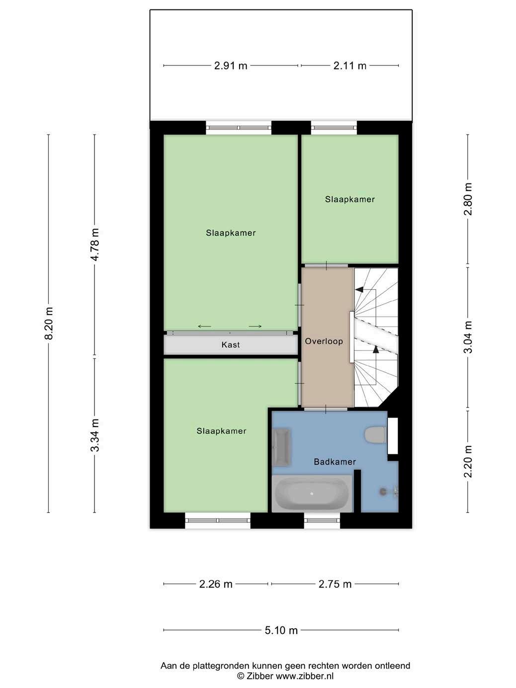 De overloop geeft toegang tot de drie slaapkamers en de badkamer. Alle slaapkamers zijn voorzien van stukwerk op de wanden en een laminaatvloer. De grote slaapkamer is voorzien van een airco. De badkamer is betegeld en voorzien van een ligbad, inloopdouche, hangend toilet en een wastafel.