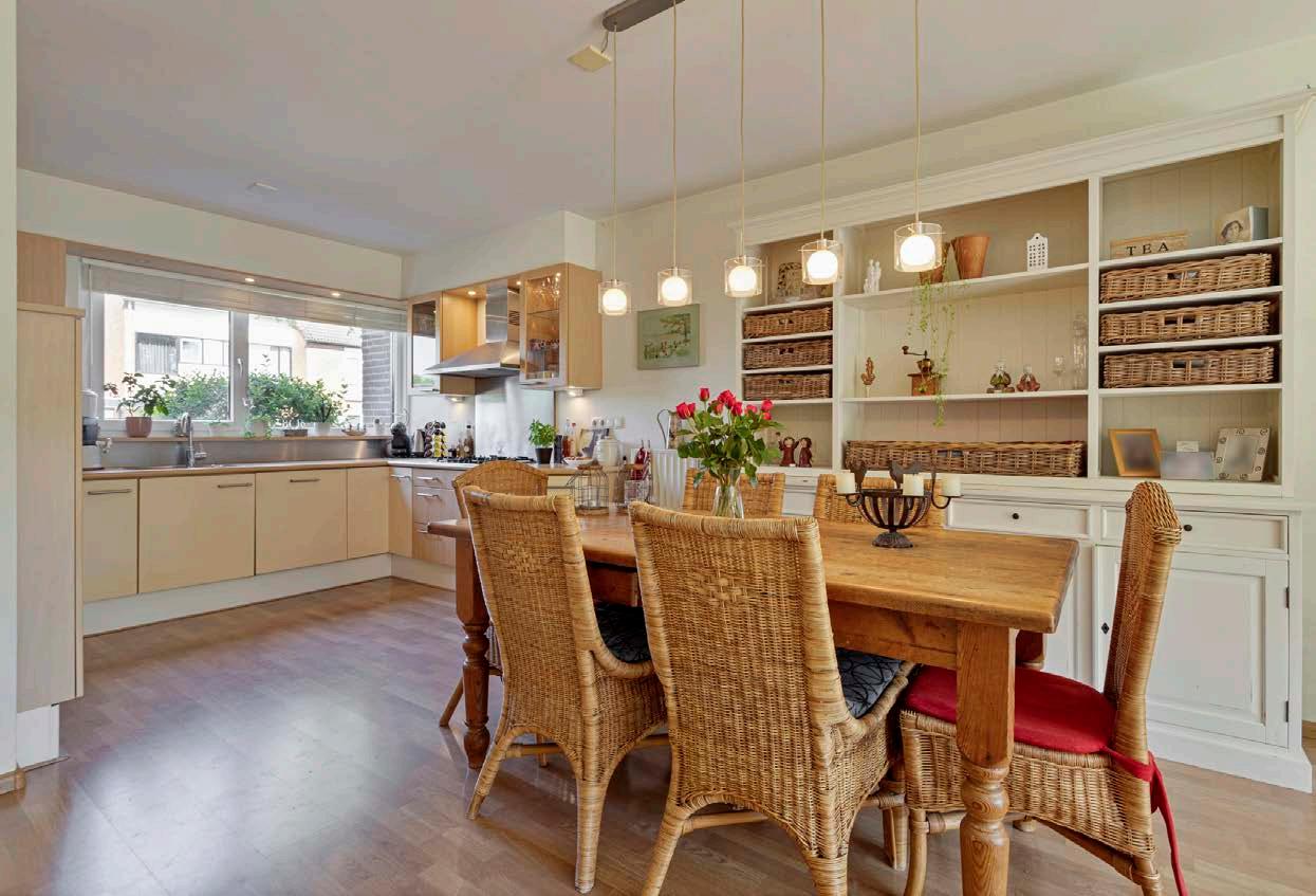 We lopen door naar de open keuken. Deze gezellige, wat verouderde keuken is voorzien van alle nodige inbouwapparatuur zoals een vaatwasser, koelkast, oven, magnetron, gasfornuis en afzuigkap. Deze zijn in de afgelopen jaren grotendeels vervangen En weet je wat het beste is? Er is genoeg ruimte voor een eethoek naast de keuken, zodat je gezellig kunt tafelen met je dierbaren. En als de keuken toch niet helemaal je smaak is, kun je deze altijd moderniseren naar jouw eigen wensen. Hoe gaaf is dat?