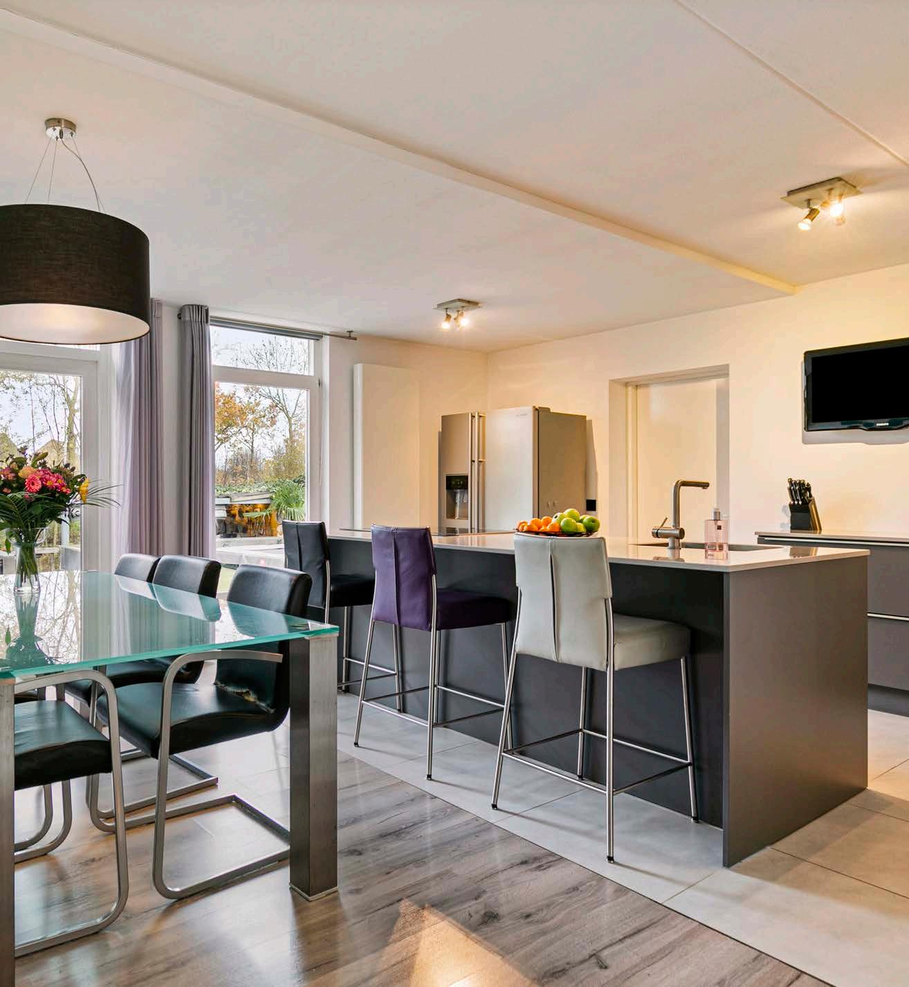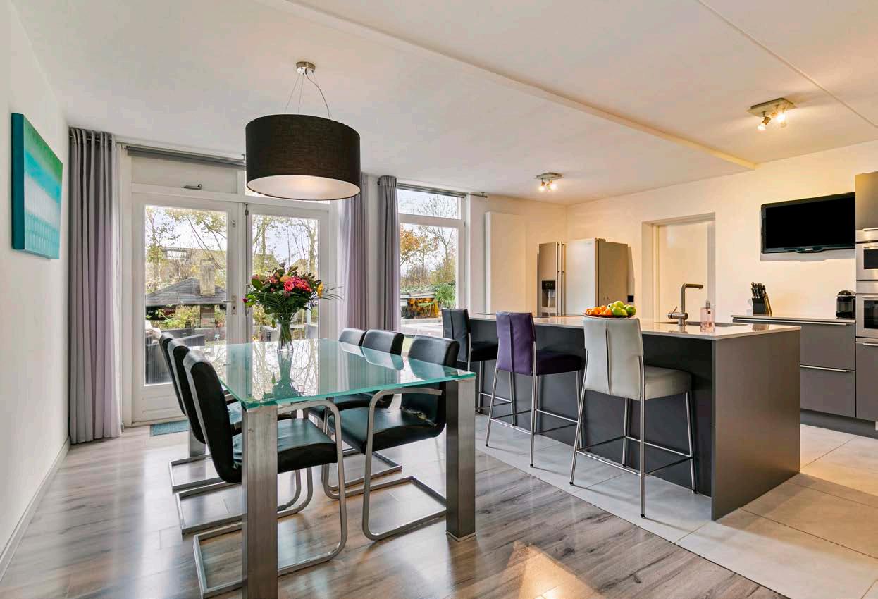 Onze keus voor dit huis komt voornamelijk door de charme van de tuin aan het water. In de zomer is het daar heerlijk vertoeven en is er veel privacy door de bebossing aan de slootkant. Zo nu en dan maken we met de kinderen een tochtje met de roeiboot over het water. De buitenkeuken geeft het optimale vakantiegevoel in eigen tuin, waardoor wij daar in de zomer vaak zijn te vinden. De ruimtelijke keuken binnen is voor ons erg gezellig, zodat het koken altijd in gezelschap kan plaatsvinden door een gesprekje aan de bar. Er is veel licht door de grote ramen en openslaande deuren met veel beglazing waardoor de tuin in de zomer een onderdeel van het huis wordt.
