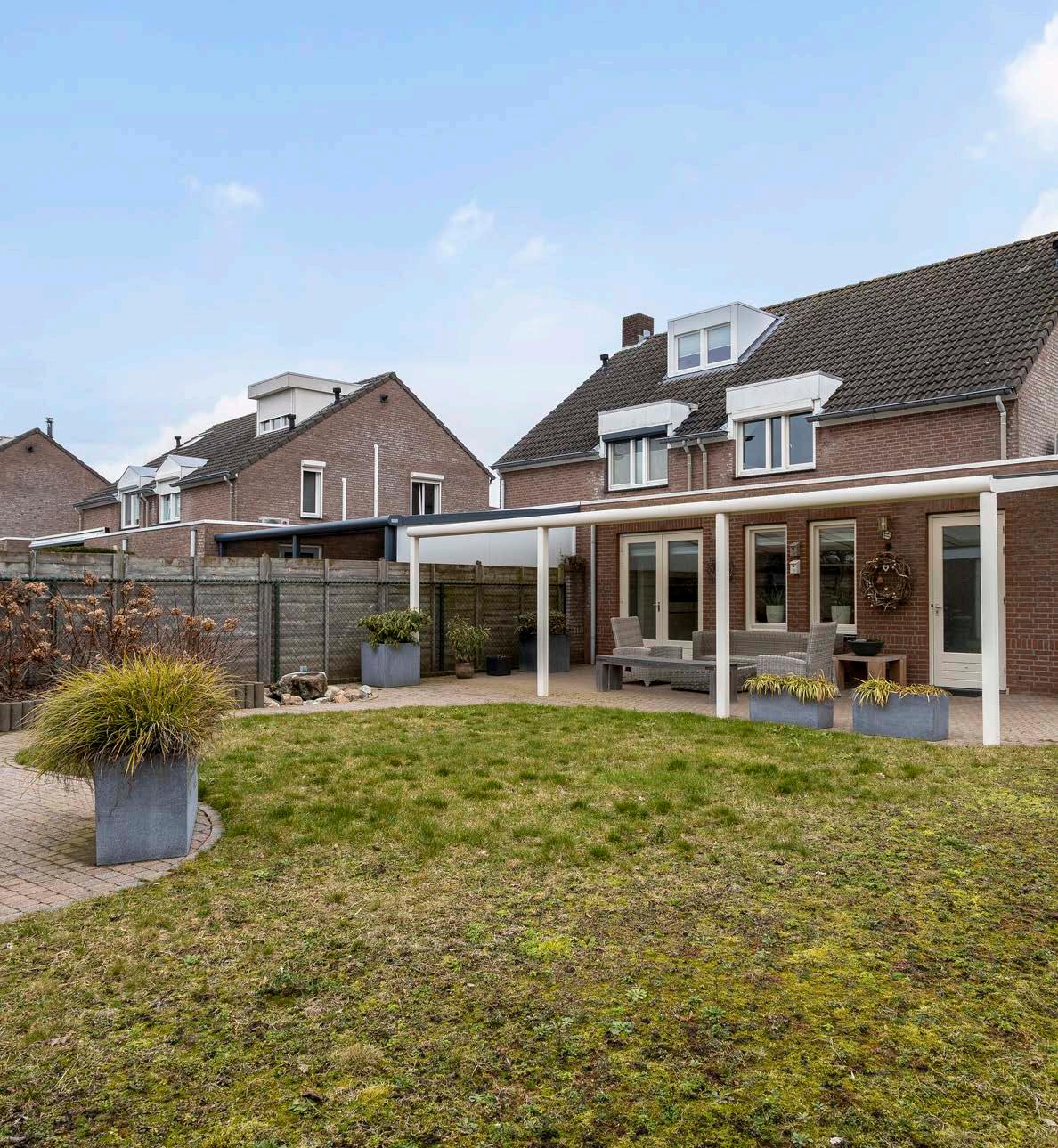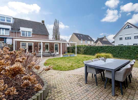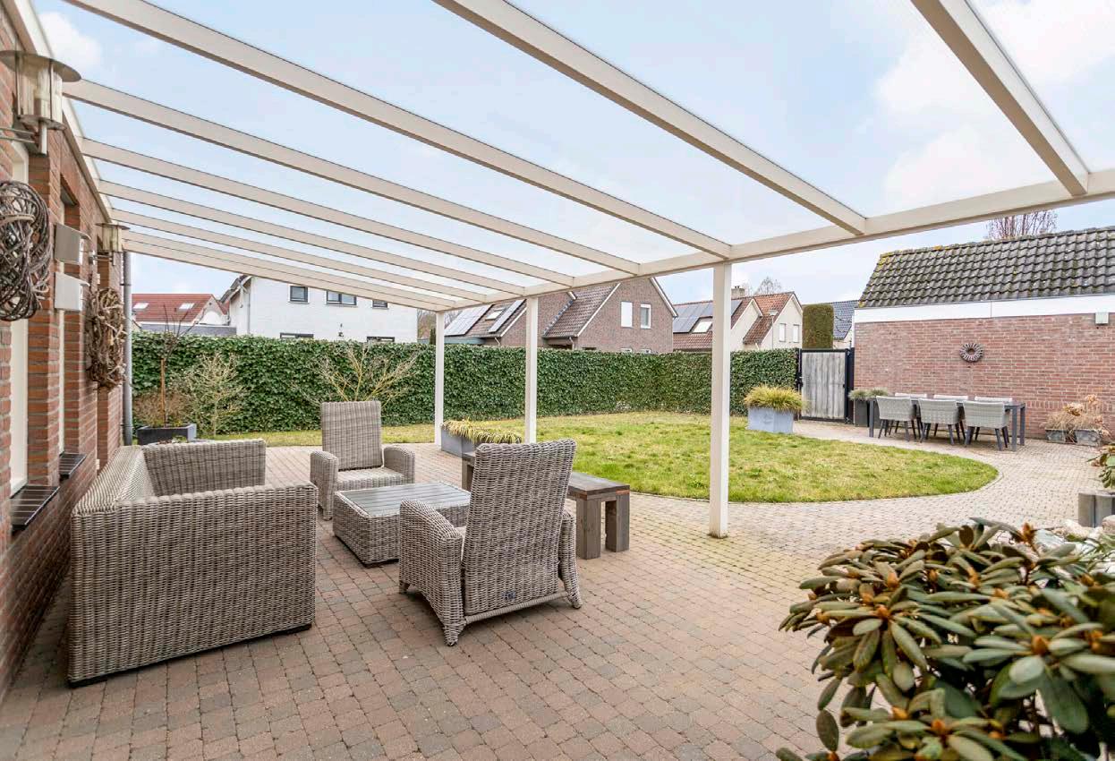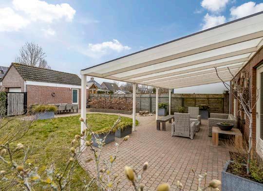En dan hebben we nog de riante achtertuin. Via de openslaande deuren vanuit de eetkamer komen we in de grote achtertuin die is gelegen op het oosten. Hier kan je in alle privacy genieten van het buitenleven. De tuin is fraai aangelegd met een groot overdekt terras aan de achterzijde en met sierbestrating, een gazon en diverse groene beplanting. Daarnaast is er een grote vrijstaande garage waar meer dan voldoende ruimte om je tuingereedschap hier in op te bergen. Daarnaast is er voor de garage een ruime oprit voor je auto.