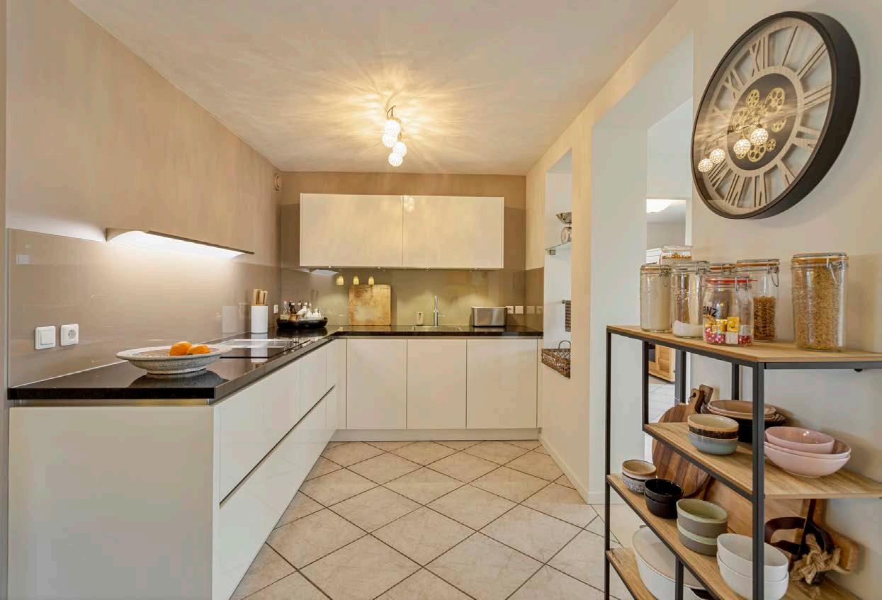 Aansluitend tref je de eenvoudige zeer nette witte hoogglans open keuken die is geplaatst in een L-opstelling. Ook de keuken is aangenaam licht. De keuken is uitgerust met diverse apparatuur, waaronder een vaatwasser, koelkast, magnetron, oven en stoomoven, inductiekookplaat met ingebouwde afzuiging en teppanyaki-plaat. Iedere hobby kok kan zich hier helemaal uitleven!