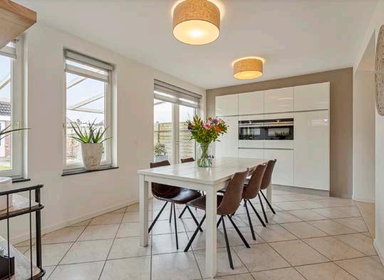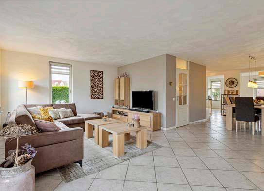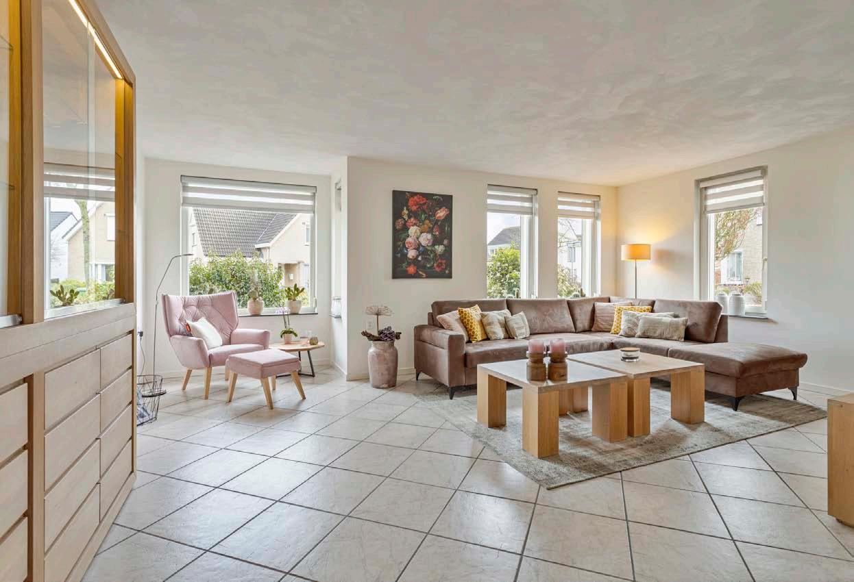 De grote woonkamer is heerlijk licht dankzij de vele ramen en de openslaande deuren naar de achtertuin. Hierdoor valt er aangenaam veel daglicht naar binnen. Je hebt door de ruime afmetingen volop mogelijkheden voor een ruime zithoek bij de tv en een gezellige eethoek direct bij de open keuken. Het geheel is afgewerkt met een tijdloze tegelvloer met vloerverwarming.