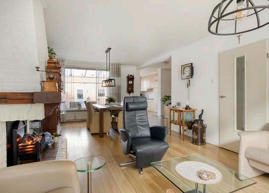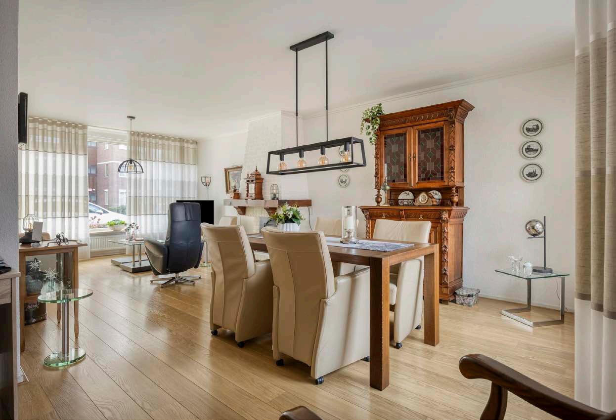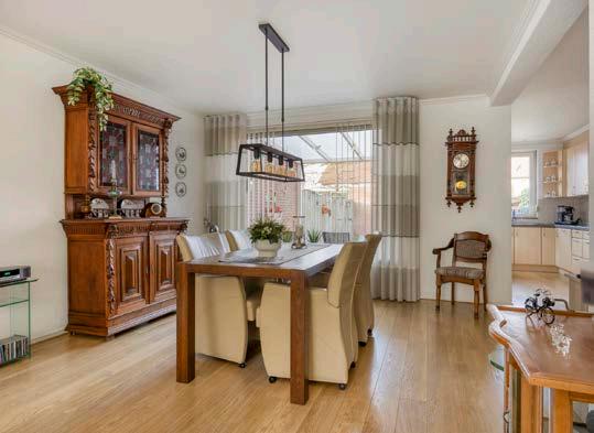 De woonkamer is opvallend licht dankzij de grote raampartijen aan voor- en achterzijde. De lichte vloer zorgt voor een rustige basis en laat de ruimte nog royaler aanvoelen. Hier is plek voor een grote zithoek én een gezellige eethoek, met direct contact naar de uitgebouwde keuken en serre. Een fijne leefruimte waar het dagelijks gezinsleven centraal staat.