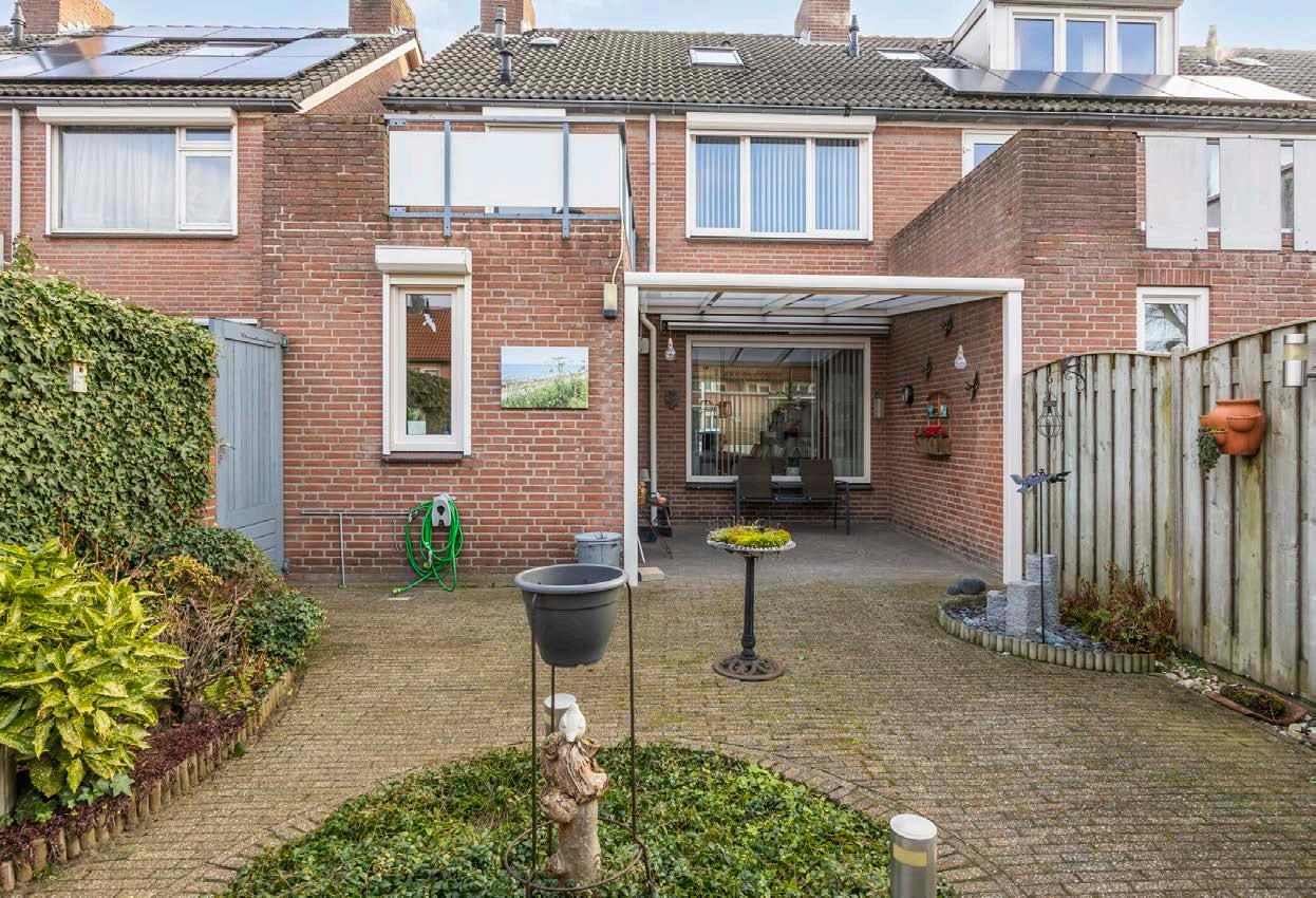 De diepe achtertuin op het westen biedt zon in de middag en avond – precies wanneer je thuis bent. Er is ruimte voor spelende kinderen, een loungeset of een lange eettafel voor zomerse diners. Met een achterom, stenen berging en directe toegang tot de garage is de tuin niet alleen sfeervol, maar ook praktisch in gebruik