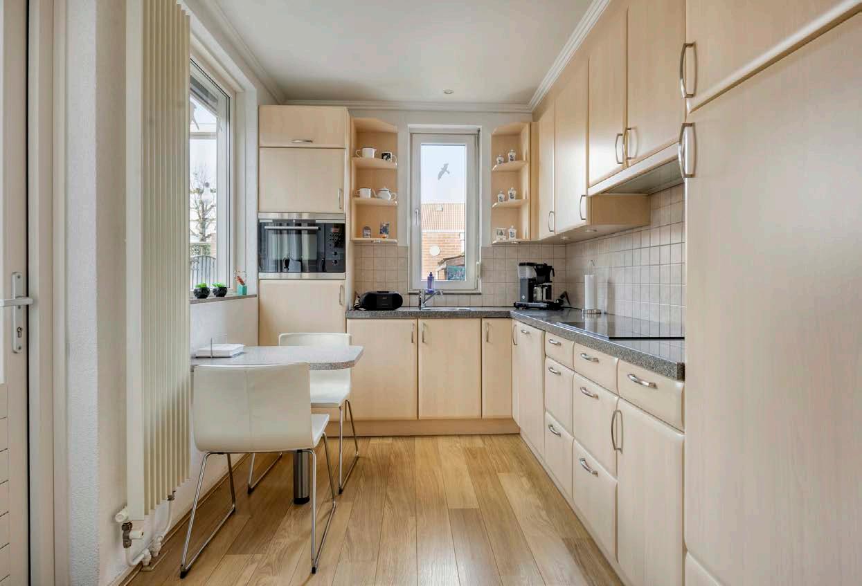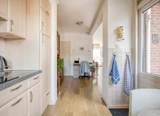 De keuken bevindt zich in de uitbouw en biedt volop werk- en bergruimte. Dankzij de directe aansluiting op de serre ontstaat een prettige overgang tussen binnen en buiten. Of je nu uitgebreid kookt of snel ontbijt voordat de dag begint, deze keuken is functioneel ingericht en vormt het hart van de woning.
