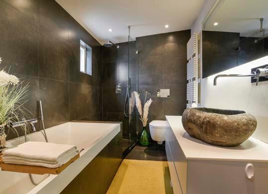De zeer luxe badkamer is van grond tot plafond betegeld en heeft ingebouwde plafondspots. De indeling bestaat uit een ligbad met ingebouwde televisie, wastafelmeubel, toilet, inloopdouche en een designradiator.