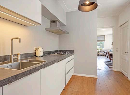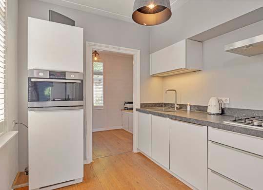 De mooie dichte keuken is geplaatst in een handige wandopstelling, waardoor je over voldoende werk- en opbergruimte beschikt. De keuken is uitgerust met moderne apparatuur, waaronder een combi-oven, vaatwasser, gaskookplaat en afzuigkap. Naast de keuken is er ruimte voor een gezellige eethoek, waar je samen kunt genieten van heerlijke maaltijden. Vanuit de keuken heb je toegang tot de bijkeuken en het toilet.