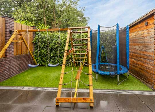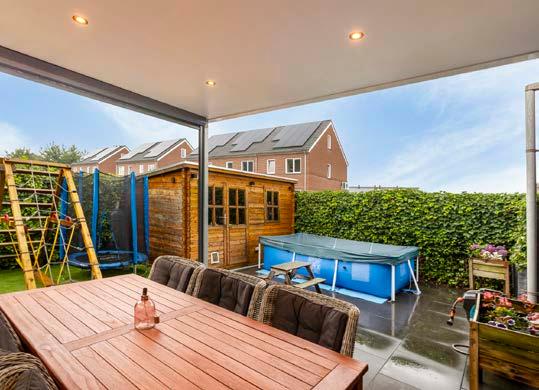 De tuin is werkelijk een pareltje, gelegen op het zuidwesten zodat je de hele dag door kunt genieten van de zon of juist van de schaduw onder het overdekte terras. Stel je voor dat je hier in de zomer barbecues organiseert, terwijl de kinderen veilig spelen op het gazon. De tuin is groot genoeg voor een trampoline, een moestuin of zelfs een luxe loungeset waar je met vrienden en familie kunt relaxen.