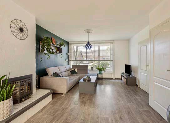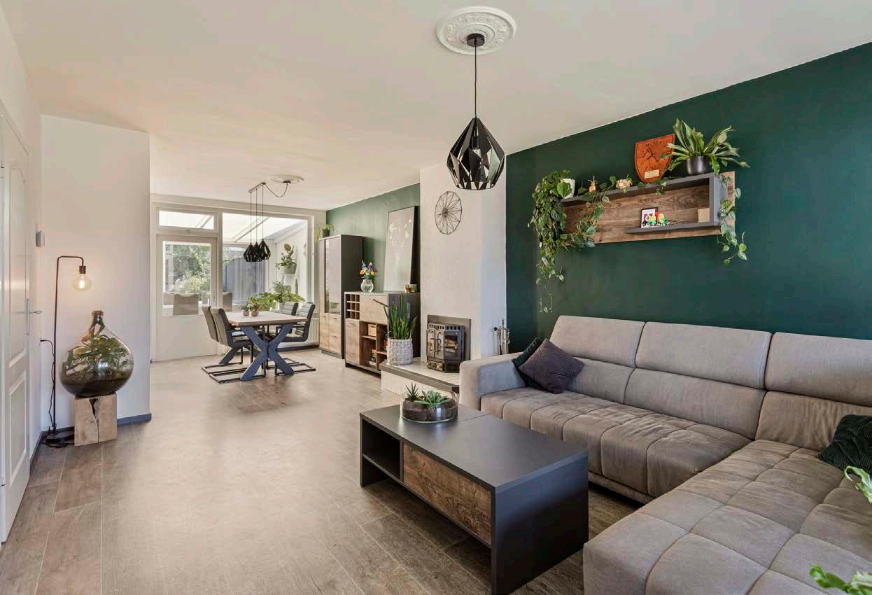 Stap binnen in de ruime en lichte woonkamer waar de authentieke houtkachel de show steelt. Hier geniet je van gezellige avonden met het knisperende geluid van brandend hout en de sfeervolle warmte die de ruimte vult. Grote raampartijen zorgen voor volop natuurlijk licht, terwijl de laminaatvloer een warme en huiselijke sfeer creëert. Dit is de perfecte plek om tot rust te komen na een drukke dag of om samen te zijn met vrienden en familie.