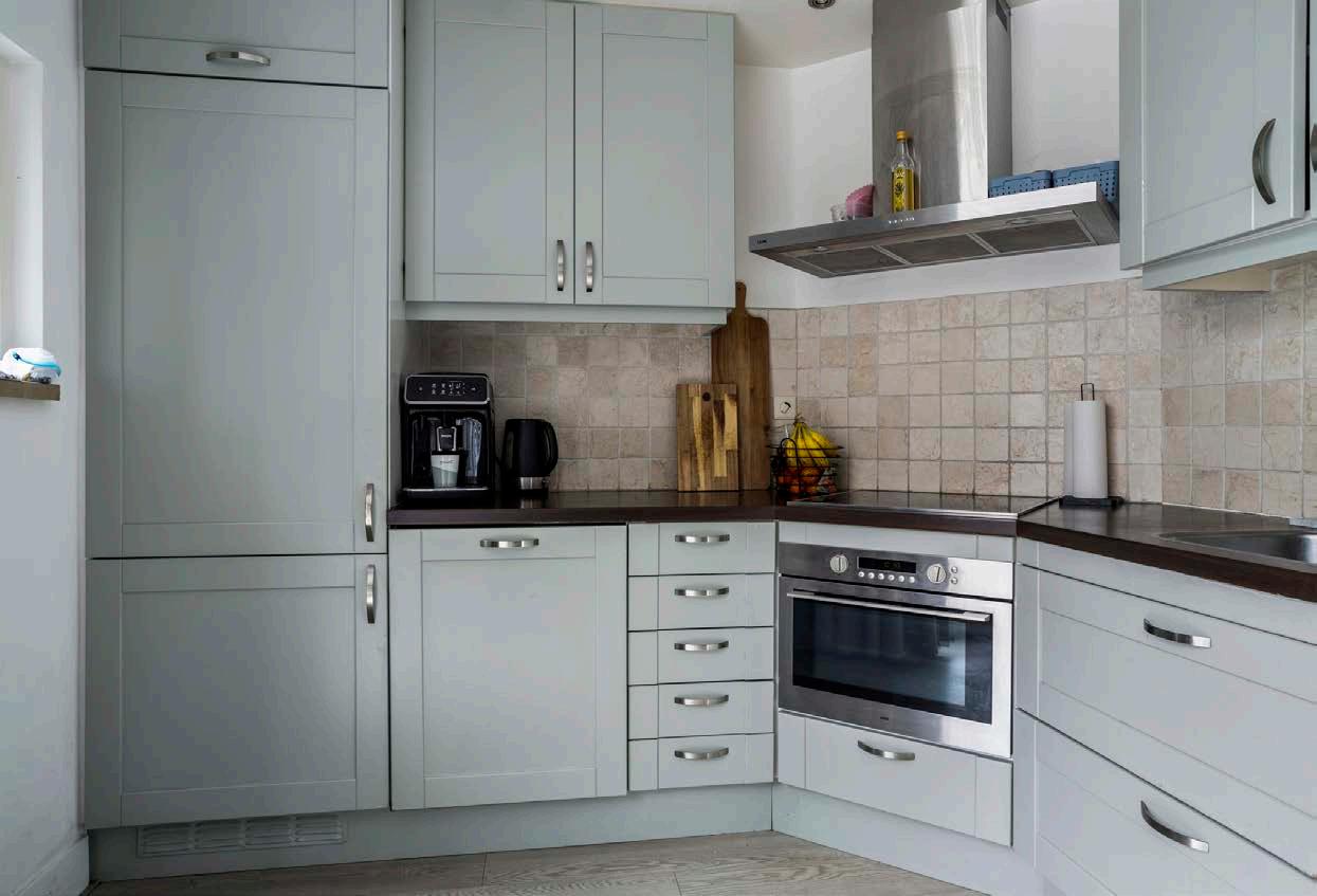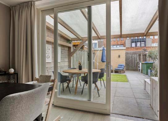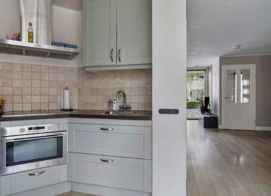 De L-vormige keuken is compleet en modern ingericht met kunststof blad en beschikt over alle inbouwapparatuur, zoals een vaatwasser, combimagnetron en inductiekookplaat. Door de open verbinding kun je goed contact houden met elkaar. Pluspunt: het zicht en de schuifpui naar de tuin!