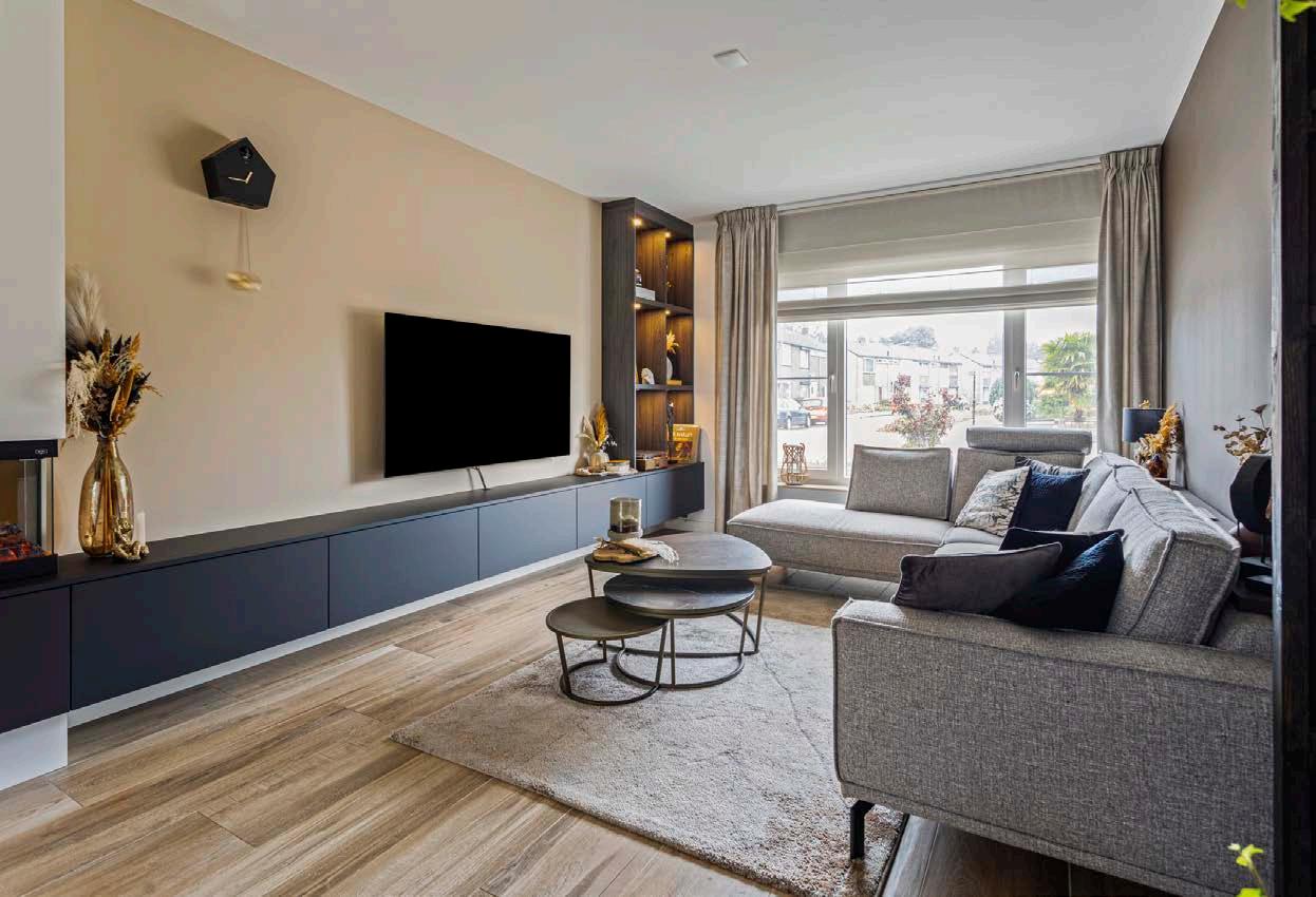 Stap binnen in een zee van ruimte en licht in de uitgebouwde woonkamer. Met een moderne afwerking, strakke lijnen en grote ramen die het daglicht prachtig binnenlaten, is deze woonkamer de ideale plek om te ontspannen of om gasten te ontvangen. De ruimte biedt voldoende mogelijkheden voor een comfortabele zithoek en een ruime eettafel, perfect voor gezellige familie-etentjes of avonden met vrienden.