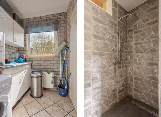 Grenzend aan de keuken bevindt zich nog een praktische bijkeuken met extra keukenblok en een moderne douchegelegenheid. Daarnaast bevindt zich hier de aansluiting voor de wasapparatuur.