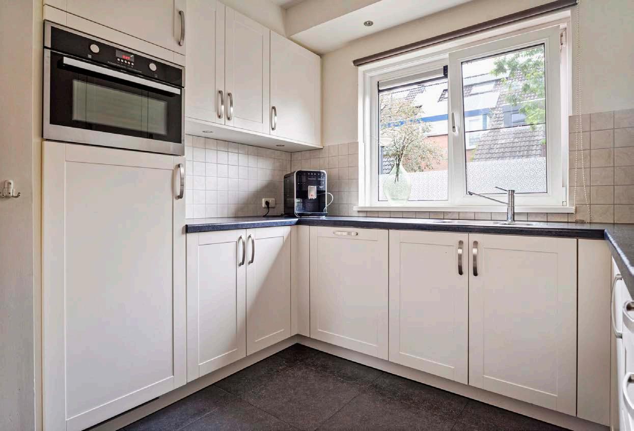 De halfopen nette keuken is uitgerust met inbouwapparatuur in de vorm van een koelkast, vaatwasser, kookplaat en combi-oven/magnetron, ideaal voor zowel snelle maaltijden als uitgebreide diners.
