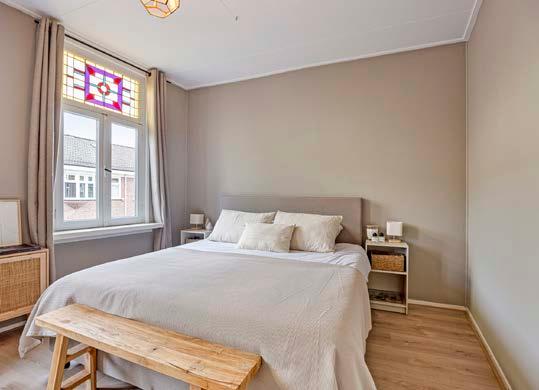 De slaapkamer aan de voorzijde is ruim genoeg voor een groot bed en wat meubels.