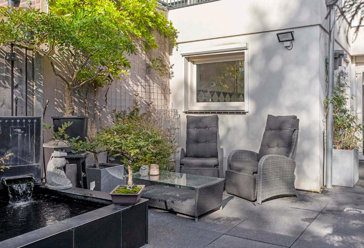 De zeer verzorgde achtertuin, die met zijn zuidwesten ligging garant staat voor zonnestralen de hele dag door. Toch zijn er voldoende schaduwplekken voor wanneer je een boek wilt lezen of een dutje wilt doen in de koelte.