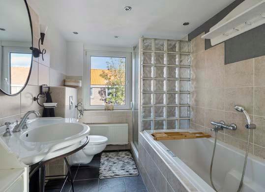 De geheel betegelde badkamer met een wastafelmeubel, toilet, aparte douchecabine met thermostaatkraan en een uitnodigend ligbad met whirlpool functie.