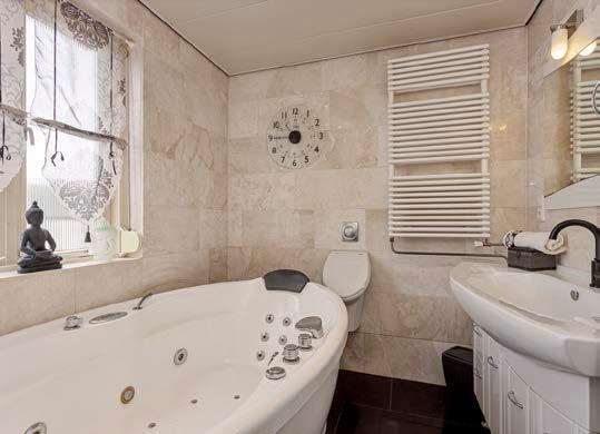 De badkamer is keurig en uitgerust met een wastafelmeubel met opbergruimte, designradiator, urinoir en een heerlijk ligbad met jets.