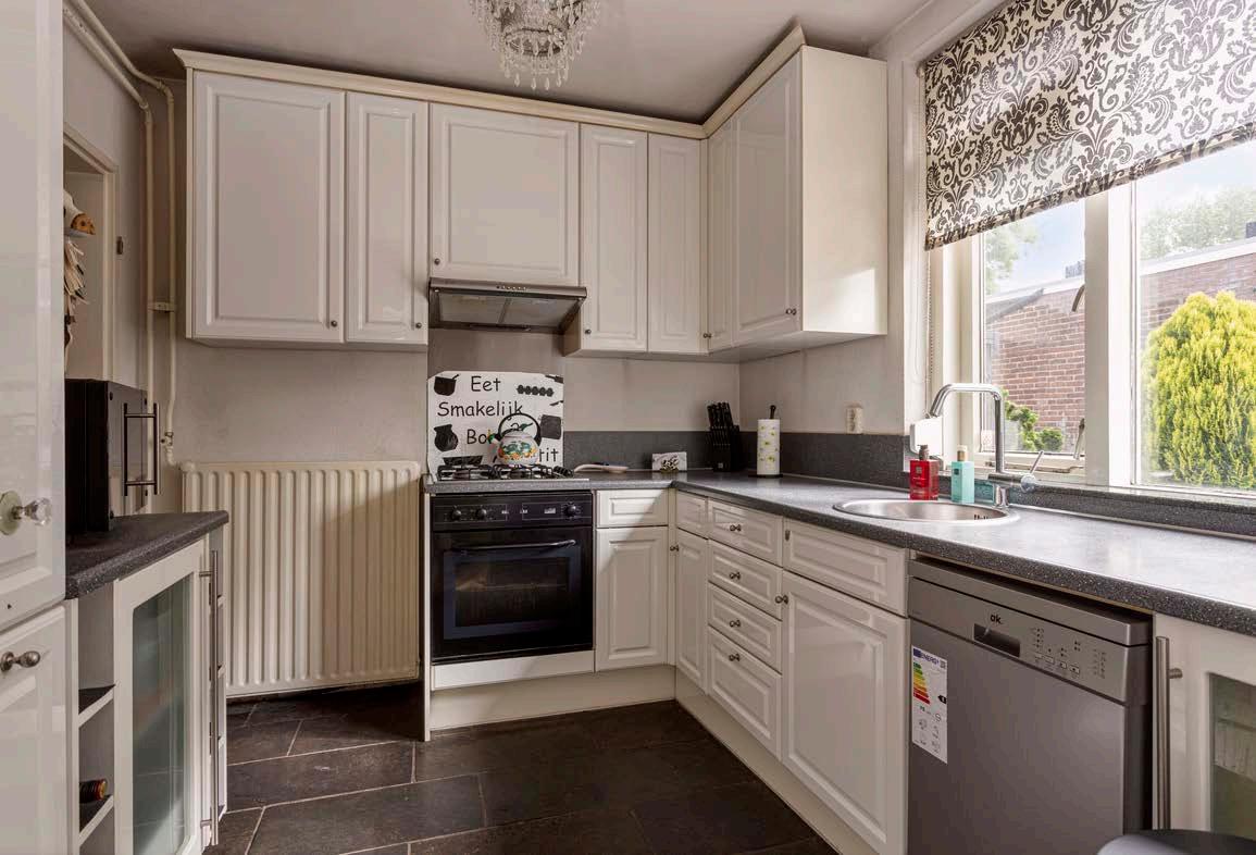 De dichte keukenruimte is voorzien van een keuken in dubbele opstelling met diverse apparatuur, zoals een gasfornuis met oven, afzuigkap, vaatwasser en een koelkast. Grenzend aan de keuken bevindt zich de praktische bijkeuken met aansluiting voor de wasapparatuur. Daarnaast verleent de bijkeuken toegang tot zowel de tuin als de inpandige garage.