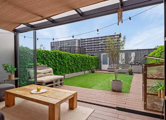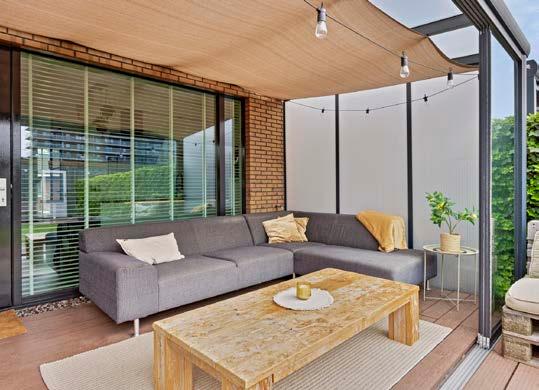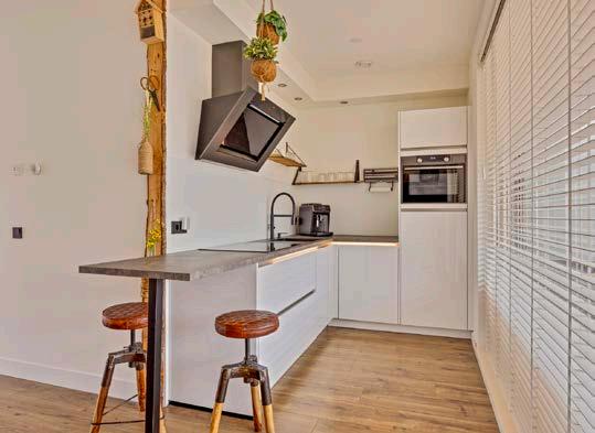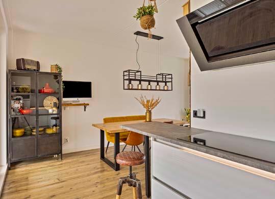 De moderne open keuken is uitgerust met een vaatwasser, inductiekookplaat, afzuigkap, koelkast en combi-oven. Vanuit de woonkamer loop je zo het zonnige dakterras met serre op, ideaal om te genieten van mooie dagen.