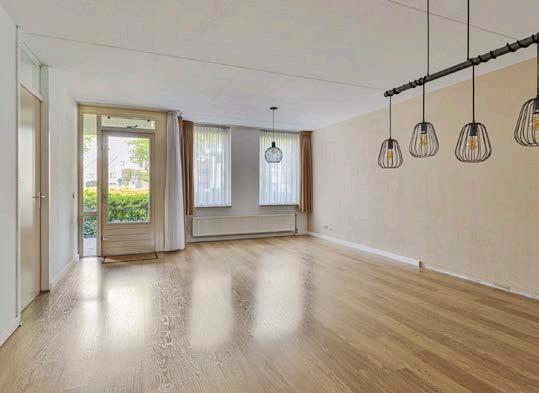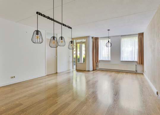 De lichte en ruime woonkamer is voorzien van grote ramen die zorgen voor veel natuurlijk lichtinval.