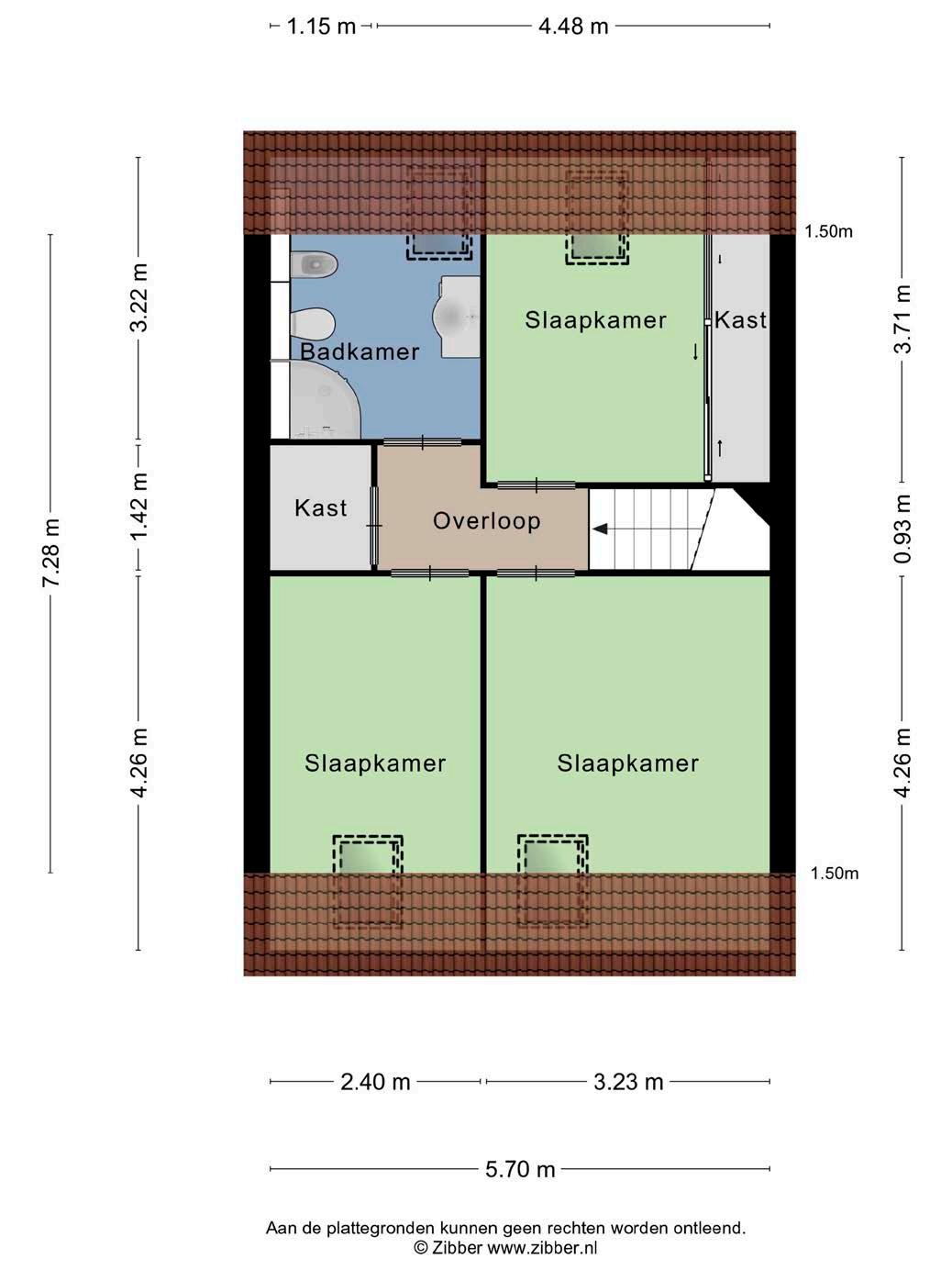 Op de tweede verdieping bevinden zich maar liefst 3 slaapkamers en een badkamer. De slaapkamers zijn afgewerkt met vloerbedekking en spuitwerk aan de wanden. De ruime badkamer is voorzien van een douche, wastafelmeubel, toilet en zelfs een bidet.
