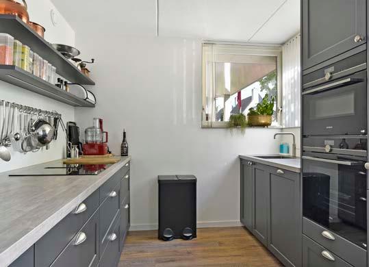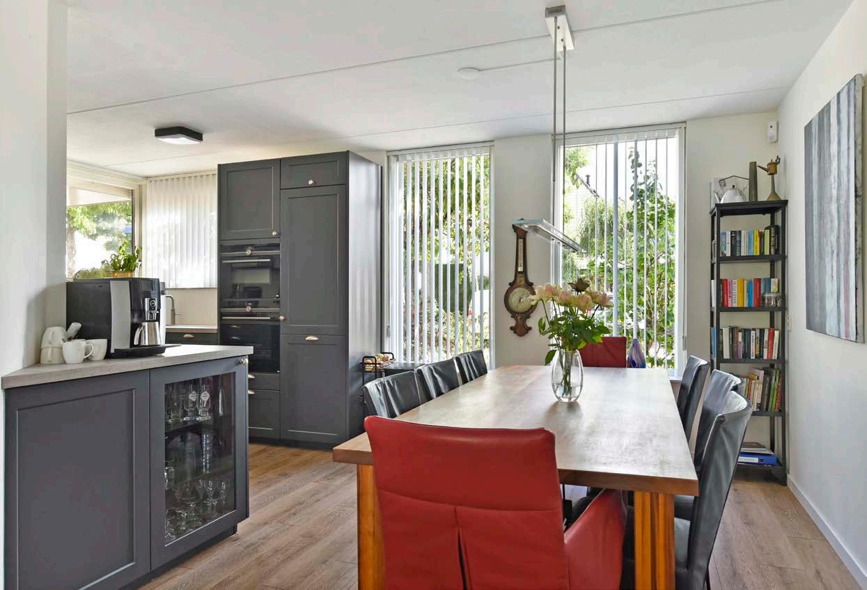 Aan de voorzijde bevindt zich de moderne keuken (2021) die voorzien is van alle gemakken en die zo is geplaatst dat je aan de ene kant voldoende werkruimte hebt met een lang aanrechtblad, ruime lades en onderkasten. De ruimte is ingedeeld met een vaatwasser, hete lucht oven, combi-magne tron, inductiekookplaat met afzuiging en koelkast met groente lades.