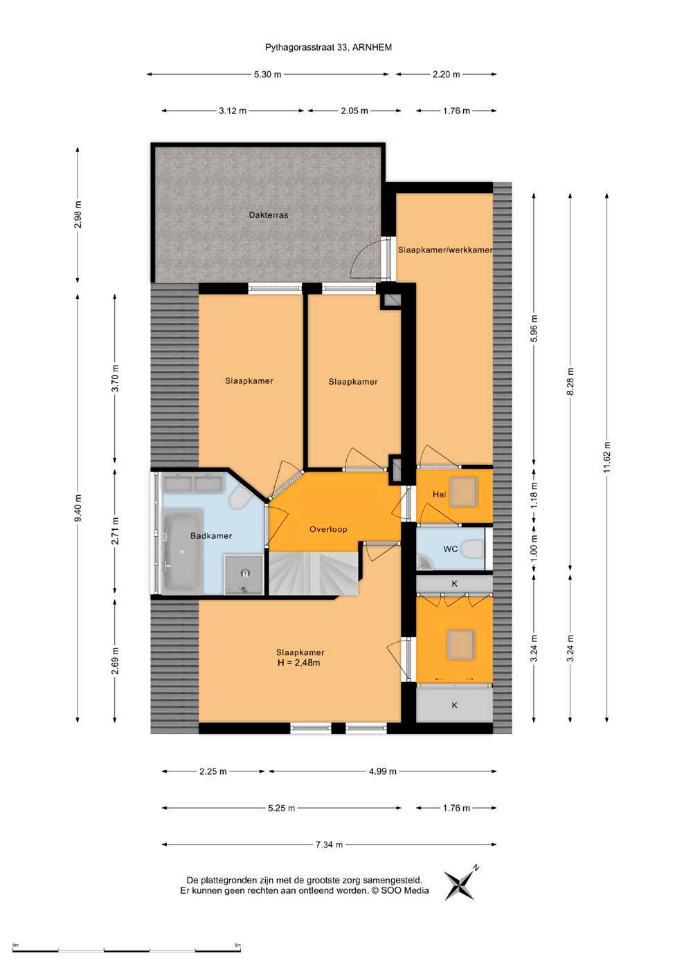 Aan de achterzijde van de woning bevinden zich 3 slaapkamers die grenzen aan het dakterras. Aan de voorzijde is de masterbedroom gecreëerd, hier heb je ook de beschikking over een inloopkast waar voldoende ruimte is om al je kleding in op te bergen. De hele verdieping is voorzien van een laminaatvloer en de wanden zijn glad gestuct in diverse kleuren.