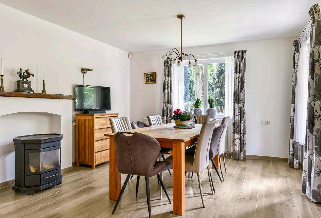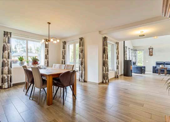 Deze lichte en royale woonkamer biedt een geweldige interactie met buiten dankzij de vele grote ramen en openslaande deuren naar de tuin. Het geheel is smaakvol afgewerkt met een houtlook tegelvloer en strak stucwerk in lichte kleuren, waardoor het een prima basis biedt voor vele verschillende interieurstijlen. De sfeervolle haard zorgt niet alleen voor een warm en huiselijk gevoel, maar ook voor lagere energiekosten. Een echte meerwaarde in deze prachtige woning! Indien gewenst is het wandje tussen het zitgedeelte en de werkplek eenvoudig te verwijderen, deze staat óp de tegelvloer.