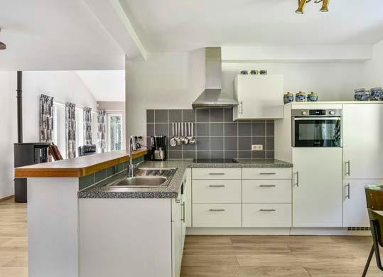 Er is een halfopen keuken aanwezig, waar een nette keuken in L-opstelling is geplaatst. Je hebt hier genoeg kast- en werkruimte tot je beschikking en bovendien is de keuken voorzien van essentiële inbouwapparatuur, zoals een keramische kookplaat, een afzuigkap, een combi-oven, een vaatwasser en een koelkast.