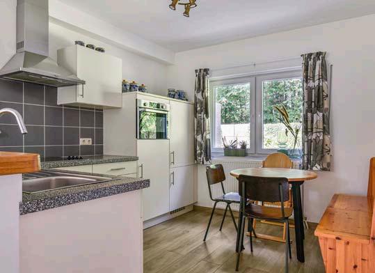Vanuit de keuken kun je de praktische bijkeuken bereiken, waar zich een vaste kast met schuifdeuren en aansluitingen voor witgoed bevinden. Hier bevindt zich de buitendeur.
