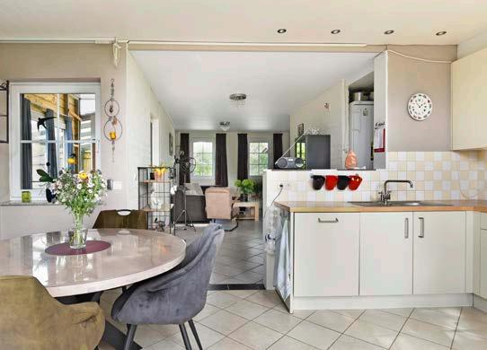 Doorlopend naar achteren kom je in de nette, open woonkeuken. Hier kun je een lange eettafel plaatsen, waardoor je tijdens het koken niets hoeft te missen van de gezelligheid aan tafel. De keuken zelf is geplaatst in een hoekopstelling en deze is uitgevoerd met witte fronten. In de keuken beschik je over voldoende kast- en werkruimte en daarnaast ben je hier voorzien van een gasfornuis, afzuigkap, oven en een vaatwasser. Verder is de keuken voorzien van een tegelvloer met vloerverwarming
