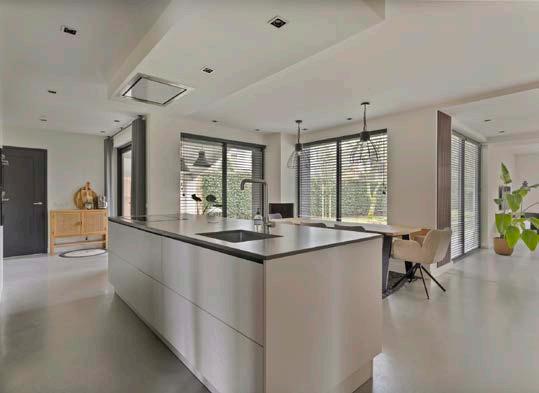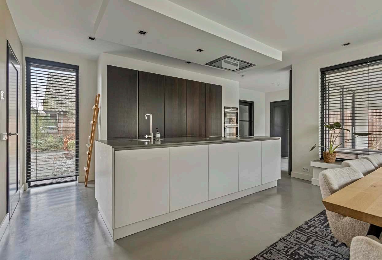 De luxe keuken in deze woning is een waar kunstwerk van modern design en functionaliteit. Het centrale kookeiland biedt niet alleen een ruime werkplek, maar fungeert ook als een gezellige ontmoetingsplek voor het gezin. Uitgerust met topklasse apparatuur, zoals een inductiekookplaat, hoogwaardige ovens en een stille vaatwasser, maakt deze keuken elke kookervaring tot een plezier. De premium materialen en stijlvolle afwerkingen stralen elegantie uit, terwijl slimme opbergoplossingen zorgen voor een opgeruimd en efficiënt werkoppervlak. Met sfeervolle verlichting die de juiste ambiance creëert, is deze keuken de perfecte plek om culinaire creaties te maken en onvergetelijke momenten te delen. Naast de keuken bevindt zich een comfortabele eethoek, perfect voor lange diners met familie en vrienden.