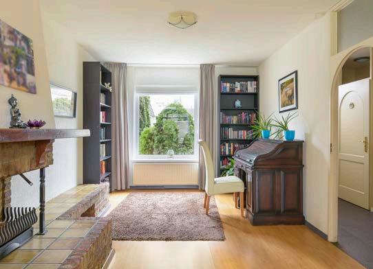 Aan de voorzijde bevindt zich een open haard met een mooie schouw, waar je bijvoorbeeld een knusse zithoek of werkplek kunt realiseren. Verder lopend naar achteren kom je in het eetgedeelte die enkel door een eetbar gescheiden wordt van de half open keuken. De keuken zelf is geplaatst in een U-opstelling en hier ben je voorzien van een 4 pits gaskookplaat, afzuigkap, oven, vaatwasser, koelkast en een vriezer.