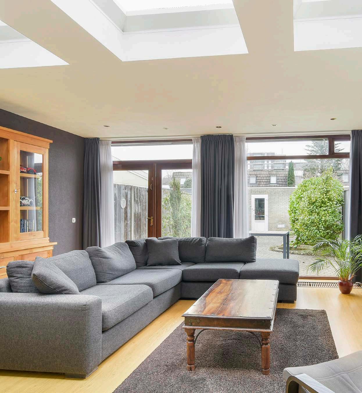 Weer een stukje naar achteren, kom je in de uitbouw van de woning, waar een ruime woonkamer is gesitueerd. Dankzij de openslaande deuren naar de tuin, het grote raam en het drietal lichtkoepels, valt er hier een zee van daglicht binnen. Het geheel is afgewerkt met laminaat op de vloer, spachtelputz in lichte kleuren op de wanden en een gestuct plafond.