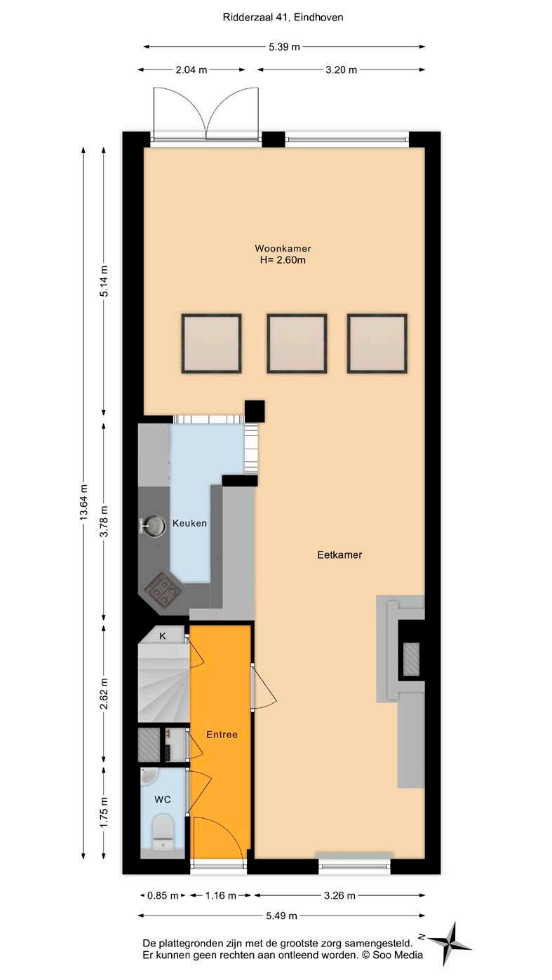 Je komt de woning binnen via de entree aan de voorzijde. Hier vind je de hal met het toilet, de meterkast en de trapopgang naar de eerste verdieping. Vanuit de hal loop je verder naar de woonkamer.