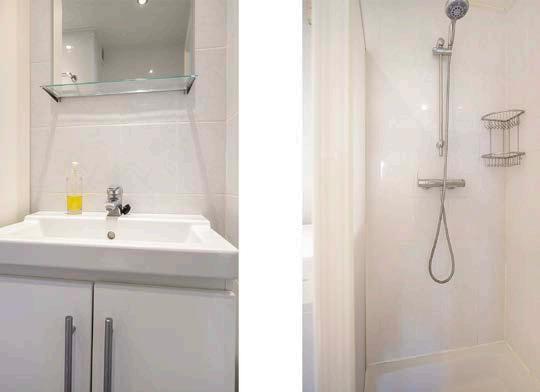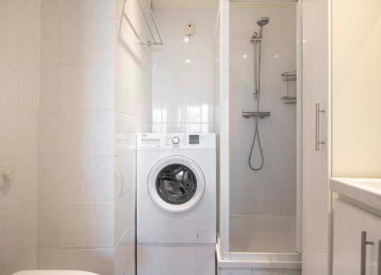 Ook de badkamer is fris en tijdloos afgewerkt en voorzien van een wastafelmeubel met opbergruimte, toilet en een douchecabine. De aansluiting voor de wasapparatuur bevindt zich eveneens in de badkamer.