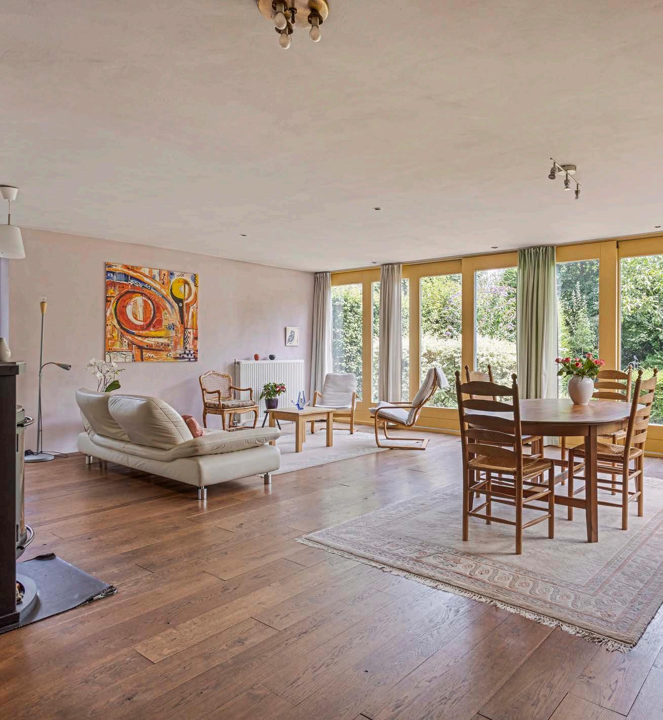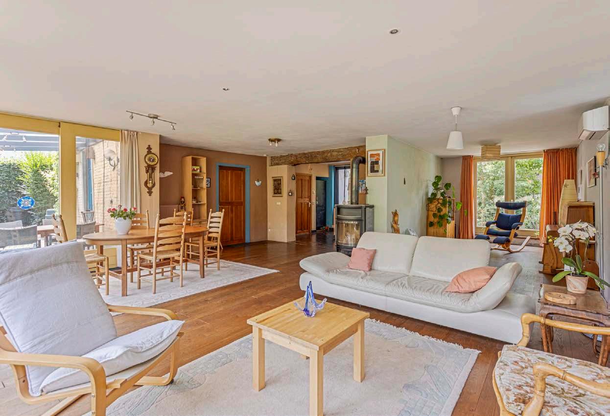 De ruime woonkamer is het hart van het huis, badend in natuurlijk licht dankzij de grote ramen. Deze open en lichte ruimte is ideaal voor gezellige familiemomenten, stijlvolle avondjes met vrienden of ontspannende uren met een goed boek. De openslaande deuren naar de tuin maken het eenvoudig om binnen en buiten te verbinden, waardoor je leefruimte nog groter aanvoelt. Hier kun je je helemaal uitleven in het creëren van een gezellige en functionele ruimte.