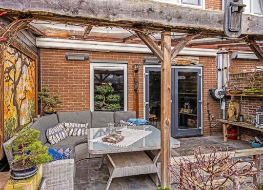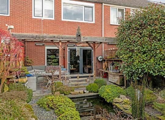 De tuin is verzorgd en biedt met zijn zuidelijke ligging volop zon. Hier kun je genieten van de rust en het geluid van water uit de vijver. Het is een plek waar je kunt ontspannen na een drukke dag of samen met het gezin van een maaltijd in de buitenlucht kunt genieten.