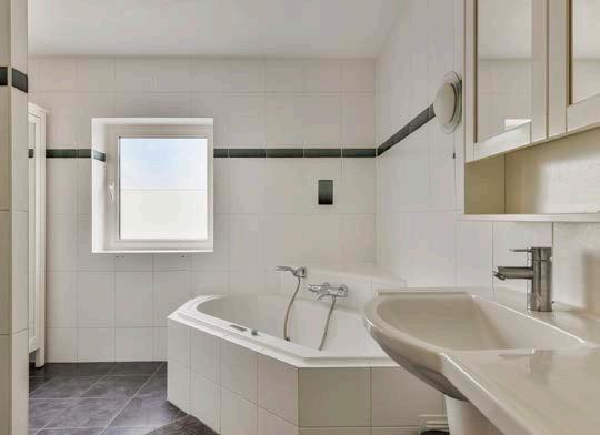 De volledig betegelde badkamer heeft alles wat je nodig hebt: een ligbad met jets, een douchecabine, zwevend toilet en een wastafel, plus een raam voor extra ventilatie en daglicht.