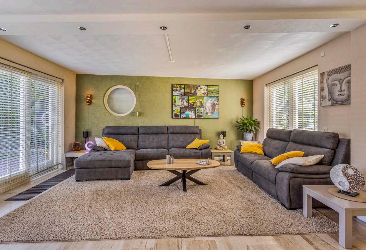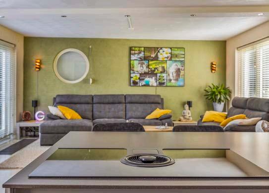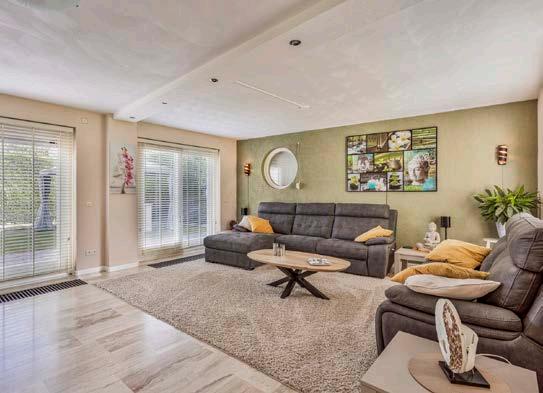 De ruime entree geeft toegang tot een praktische toiletruimte en leidt naar de lichte, open woonkamer. De woonkamer is voorzien van een tegelvloer met vloerverwarming, wat voor extra comfort zorgt in de koude maanden. Grote ramen zorgen voor veel natuurlijk lichtinval, wat bijdraagt aan een aangename sfeer in huis.