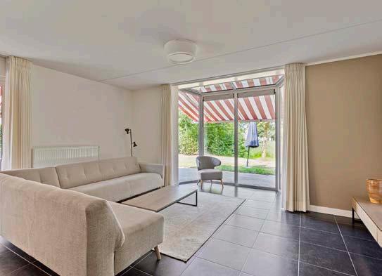 De ruime woonkamer nodigt uit tot ontspanning, met grote ramen die zorgen voor veel natuurlijk licht en een prachtig uitzicht op de tuin.
